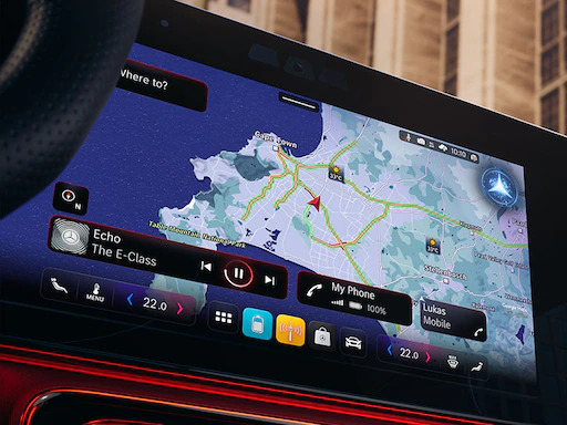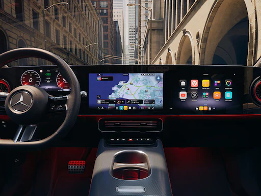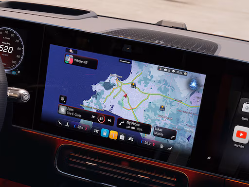 Elementul cel mai evident de la interior: noul superscreen MBUX[3], ce se extinde pe întreaga lățime a bordului, creând scena perfectă pentru noua noastră interfață intuitivă. Atât pentru șofer, cât și pentru pasager, combinația imersivă a celor trei ecrane permite accesul la o multitudine de aplicații Mercedes-Benz sau terțe, păstrând, totodată, informațiile importante în prim-plan. MBUX Superscreen disponibil din 08/2025.